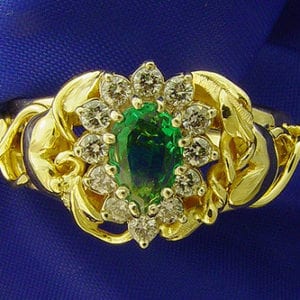 An 18kt yellow gold ring, set with one pear-shaped emerald and 12 diamonds. Photo by Mark Somma. Licensed under CC By 2.0.