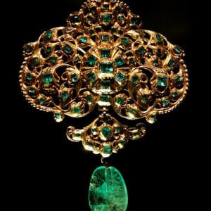 Spanish pendant, table-cut emeralds set in gold and hung with a Colombian emerald drop, from the collection of the Victoria and Albert Museum,…