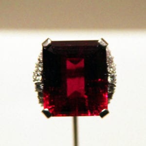 Rubellite is a variety of dark pink to red tourmaline. Stones with ruby red color such as this emerald-cut gem are highly valued. Photo by Tim Evanson.…