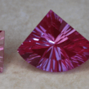 Synthetic alexandrites, concave facets, elongated emerald cut (4.45 cts), fan cut (4.51 cts), pear cut (2.57 cts). © All That Glitters. Used…