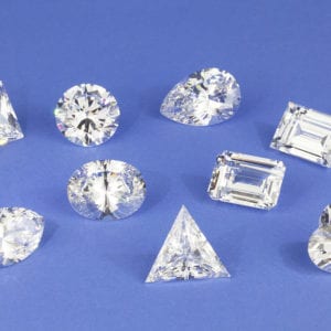 A variety of fancy diamond shapes. From left to right, top row: princess-cut diamond, round brilliant-cut diamond, pear-shaped diamond, baguette-cut…