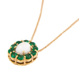 Featuring two matching golden peach conch pearls, including an unusually round one, this pendant is a true rarity. Accents in emerald and diamond.…