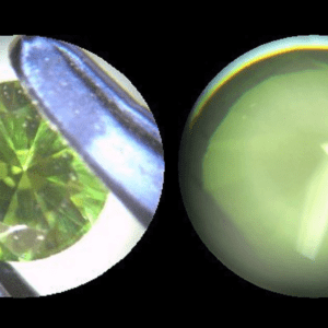 This well-cut gem (face-up and pavilion view) is actually a spinel doublet, the type frequently used to simulate more expensive gemstones. To…