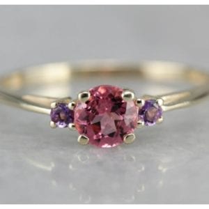Sweet and simple, this ring pairs pink tourmaline with amethyst side stones in a four-prong setting, allowing a ton of light to hit the tourmaline.…