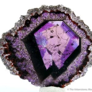 This color-zoned slice of amethyst comes from an unusual stalactitic growth. 8.2 x 7.5 x 0.3 cm. Jalgaon, Maharashtra, India. © Rob Lavinsky,…