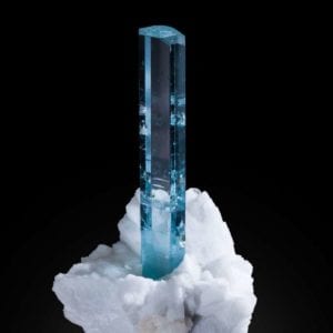 This natural aquamarine specimen, perched on a matrix of albite, could hardly be called “rough.” It shows great tone, hue, and clarity. Shigar…
