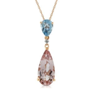 A stunning combination of beryls: pear-cut morganite and aquamarine with a diamond. Pendant measures 1 ¼ inches. © Ben Bridge. Used with permission.…