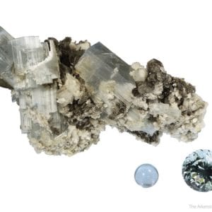 Three piece aquamarine rough and cut set. Crystal specimen, 9.7 x 5.0 x 3.8 cm; Portuguese round brilliant cut, 18.47 mm and 32.65 cts; Cat’s eye…