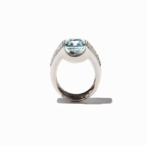 The tension setting in this 18k white gold ring protects the 4-ct, emerald-cut aquamarine center stone while allowing light to enter the stone’s…