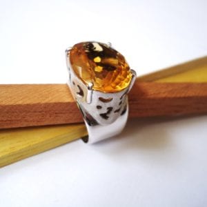 Citrine set in a rhodium-plated silver ring. Ring and photo by Mauro Cateb. Licensed under CC By-SA 3.0.
