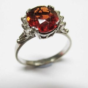 White gold ring with an oval-cut spessartite garnet in a claw setting, between trios of single-cut diamonds. Photo courtesy of liveauctioneers.com…