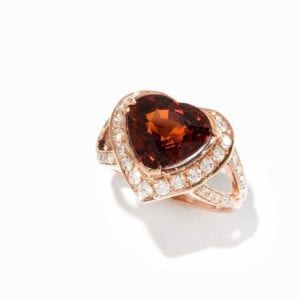 18k rose gold ring with heart-shaped spessartite, 4.78 cts, and 35 brilliant-cut diamonds, 0.92 ctw. Photo courtesy of liveauctioneers.com…