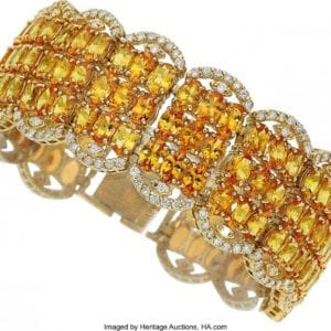 14k gold bracelet with approximately 55-ctw oval-cut spessartites and 3.75-ctw diamonds. Photo courtesy of liveauctioneers.com and Heritage…