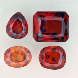 Spessartites: Brazil (4.05), Madagascar (15.40) // Amelia, Virginia (4.65), locality unknown (6.41). Photo © Joel E. Arem, PhD, FGA. Used with…