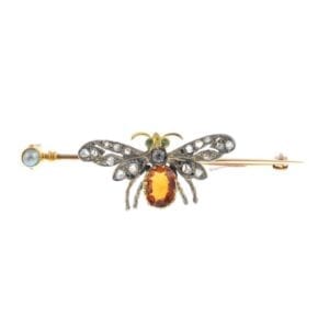 An early 20th century gold brooch designed as an insect. It has a body made from an old-cut diamond and oval spessartite, tsavorites for eyes, single-cut…