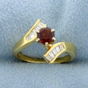 18k yellow gold ring with garnet center stone and 0.5-ctw baguette-cut diamond accents, F color, VS clarity. Photo courtesy of liveauctioneers.com…
