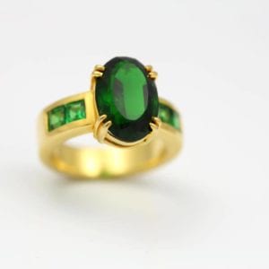 This chrome tourmaline center stone has a beautiful, bold color, accented with tsavorite garnets. © Aharoni Jewellery. Used with permission.…