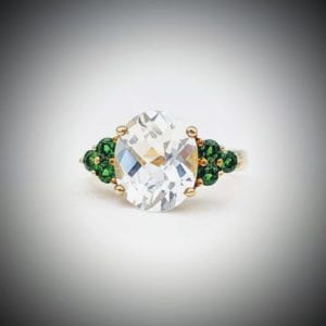 This ring combines goshenite with rare demantoid garnets. Photo courtesy of Jasper52 and liveauctioneers.com…