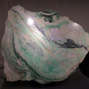 Jadeite slab, ~1 meter across, from Hpakan, Myanmar, on display at the American Museum of Natural History, New York City. Photo by Kelly Nash. Licensed…