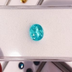 An oval paraíba tourmaline, highly included but with beautiful color. © Urth Kandi Jewelry. Used with permission.