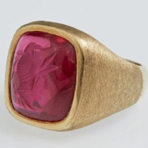 Dating from the early 20th century, this men’s 10k yellow gold ring features a bezel-set synthetic ruby with an intaglio carving of a Roman soldier.…