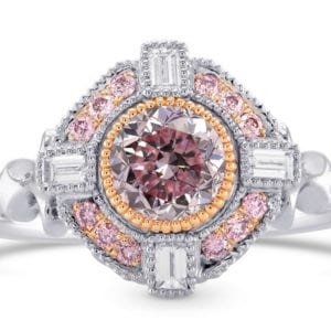 This stunning engagement ring by Leibish features a 0.59-ct, round, fancy intense purplish pink diamond center stone and a halo of colorless and…
