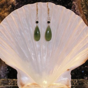 “Jade Earrings, Starlite Jewelry Designs,” natural British Columbia nephrite jade, 14K gold, with micro-faceted white topaz and black…