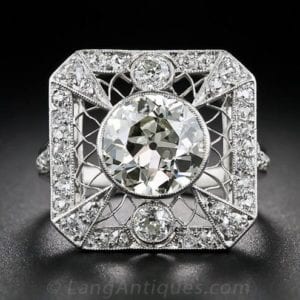 This Edwardian ring highlights the intricate, platinum lattice work common in jewelry of this period. The old European-cut diamond weighs 2.20…