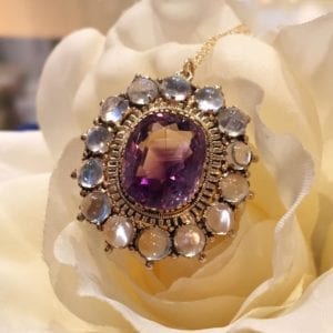 Small moonstones can make wonderful jewelry accent stones. Victorian pendant featuring an amethyst surrounded by transparent moonstones,…