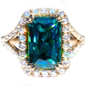 7.66-ct deep-blue Cambodian zircon, set in a 14k gold ring and accented with diamonds. © California Girl Jewelry. Used with permission.