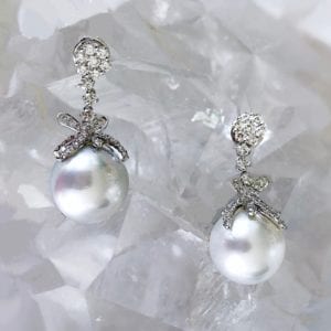 13 mm white South Sea pearl earrings with silver overtones in diamond pavé ribbon settings. © Urth Kandi Jewelry. Used with permission.