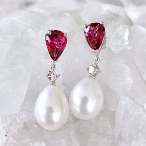 Two teardrop-shaped freshwater pearls with diamond accents and pear-cut rubellites. © Urth Kandi Jewelry. Used with permission.