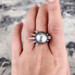 14 mm Tahitian pearl with silver overtone in a white gold-plated setting with cubic zirconia accents. © Urth Kandi Jewelry. Used with permission.…