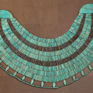 Archeologists discovered this model broad collar in the wrappings of the mummified steward Hapiankhtifi. Museum workers restrung it. Blue-green…