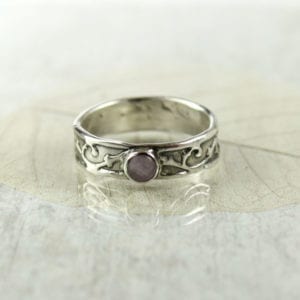 Victorian-style sterling silver ring with bezel-set amethyst cabochon. Jewelry and photo by Nana Louise Nielsen. Licensed under CC By 2.0.