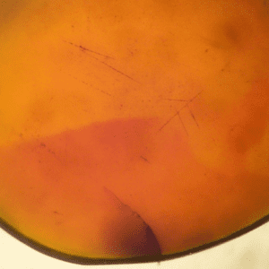 Surface pitting in smoked opal.