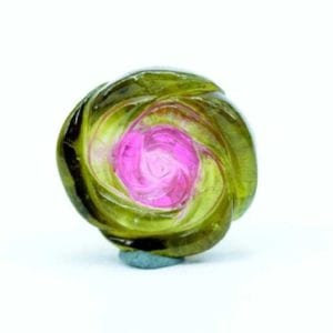 The pinkish red core of this watermelon tourmaline accentuates the carved flower against the sepals carved from the pale green rind. The stone’s…