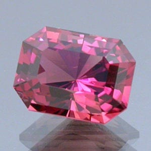 Oregon sunstone, twisted top emerald cut, coppery pink orange color, 2.57 cts. © Dan Stair Custom Gemstones. Used with permission.