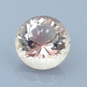 Topaz occurs in many colors, like the orangey pink of this fancy round brilliant gem. However, all topazes have a biaxial + optic character. © Dan…
